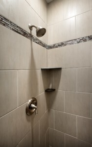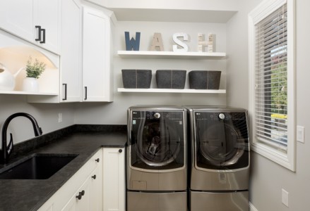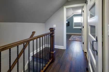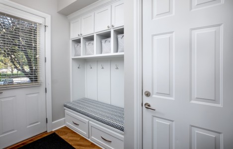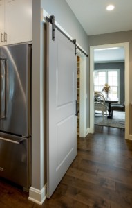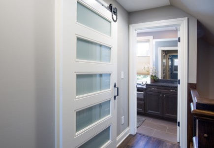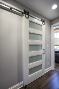 - 5 panel frosted glass doors – one upstairs hiding the stackable washer and dryer and one in the kitchen hiding the utility cabinet with the tankless water heater and misc. broom storage.
