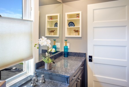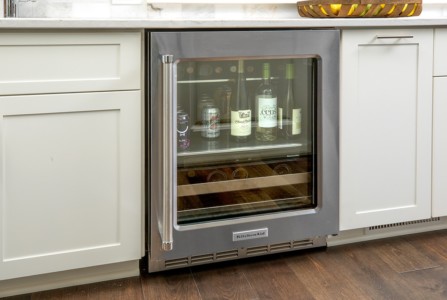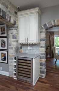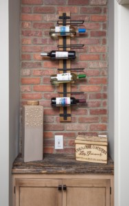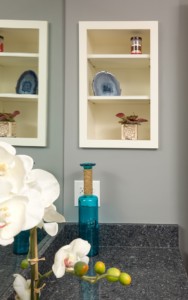 - The bar sink area with floating shelves – perfect spot to get a glass of wine or fill up the coffee pot conveniently hidden in the pantry. There is a second pull-out trash can in this area too.